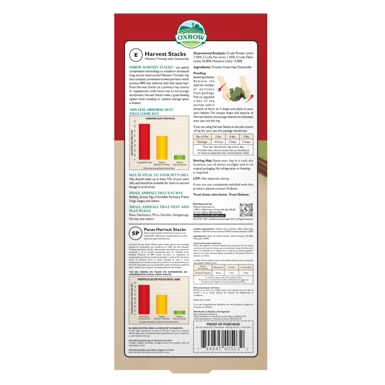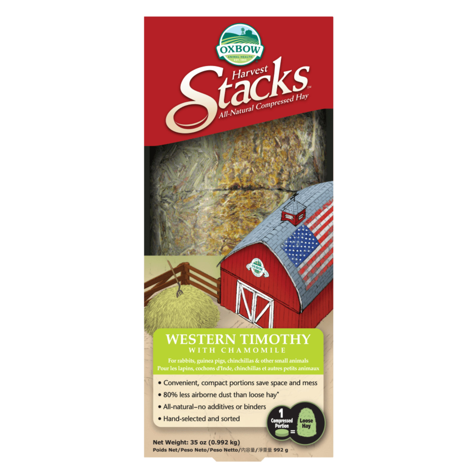 Harvest Stacks – Western Timothy cu mușețel de la Oxbow conține fân natural Western Timothy într-un format inovator și îmbogățitor. Adăugarea mușețelului face ca acest produs să fie irezistibil pentru iepuri, porcușori de Guineea, chinchilla și alți mici ierbivori.