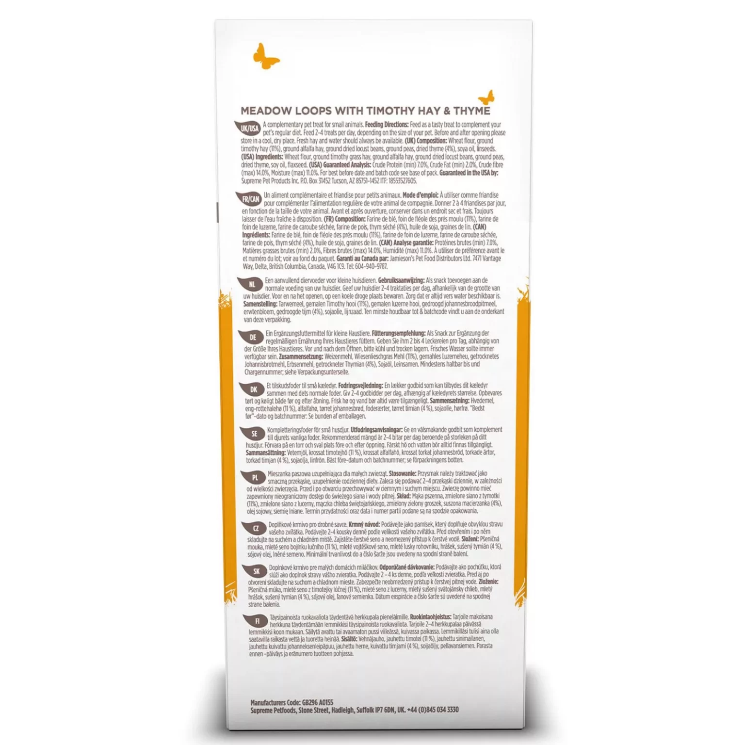 Inele naturale din fan si cimbru, Meadow Loops, sunt recompense hranitoare ce pot fi încorporate în dieta rozătoarelor, completând perfect gama de alimente și fan. Cu fibre bogate și fără zahăr adăugat, acestea sunt o modalitate gustoasa si sanatoasa de a va rasfata animalele de companie. Acestea sunt potrivite atat pentru iepuri și porcușori de Guineea, cat și pentru chinchilla, veverițe și degus.